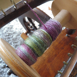 I don't know what to knit next ~ so while I think about what to make I thought I would do a little spinning. This fibre is New Zealand Half Bred and the colourway is 'Orchard' a beautiful combination of Autumnal gold/tan, greens and plum-purple, just right for this time of year.